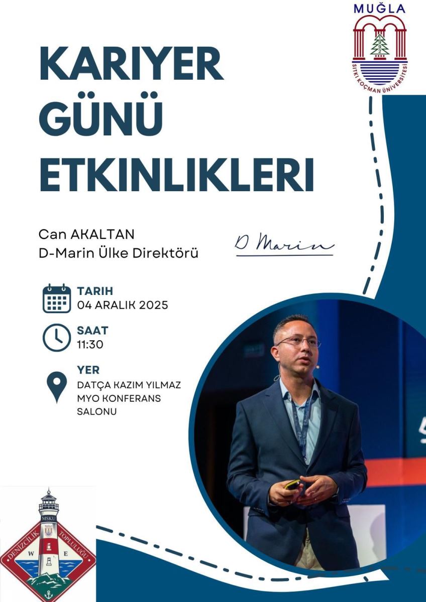 D- Marin Marinaları Genel Müdürü ile Söyleşi Kariyer Günü Etkinlikleri kapsamında, D-Marin Ülke Direktörü Can Akaltan, 4 Aralık 2025 tarihinde saat 11.30’da Datça Kazım Yılmaz Meslek Yüksekokulu Konferans Salonu’nda öğrencilerle bir araya gelecektir. 4.12.2025