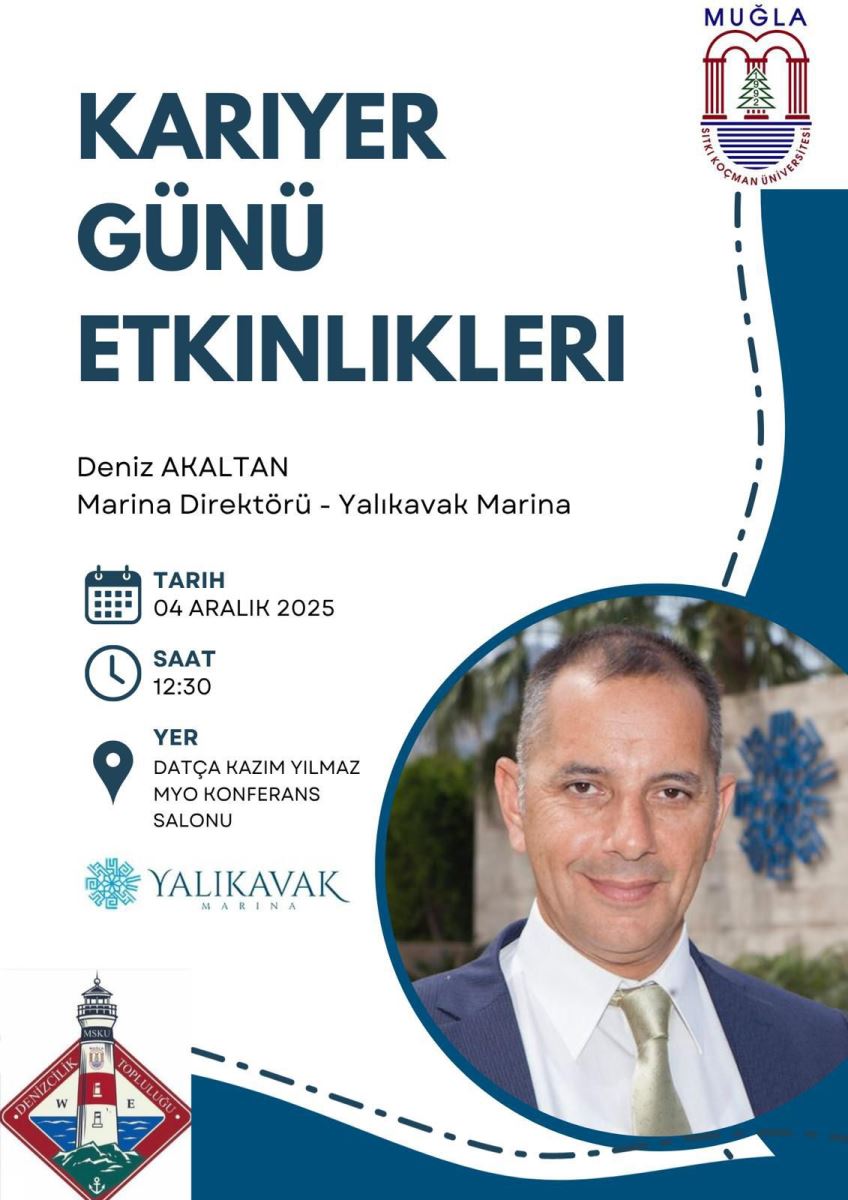 Yalıkavak Marina: Marina Müdürü ile Söyleşi Kariyer Günü Etkinlikleri kapsamında, Yalıkavak Marina Marina Direktörü Deniz Akaltan, 4 Aralık 2025 tarihinde saat 12.30’da Datça Kazım Yılmaz Meslek Yüksekokulu Konferans Salonu’nda öğrencilerle bir araya gelecektir. 4.12.2025